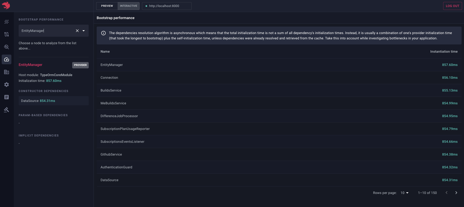 This page is particularly useful when you want to identify the slowest parts of your application's bootstrap process (e.g. when you want to optimize the application's startup time which is crucial for, for example, serverless environments).