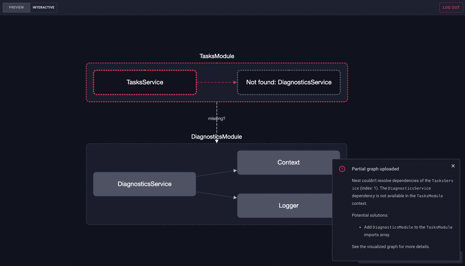 Probably the most common error message you might have seen is about Nest not being able to resolve dependencies of a provider. Using Nest Devtools, you can effortlessly identify the issue and learn how to resolve it.